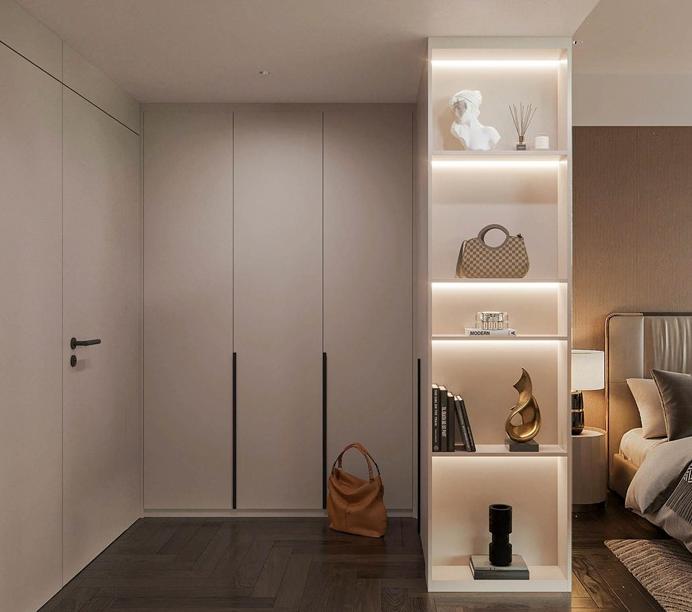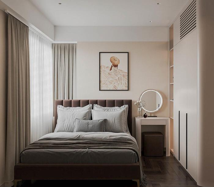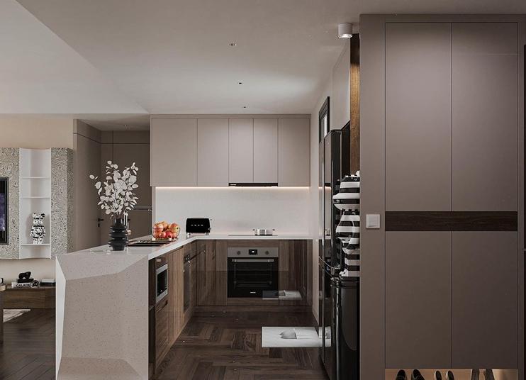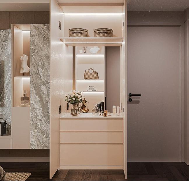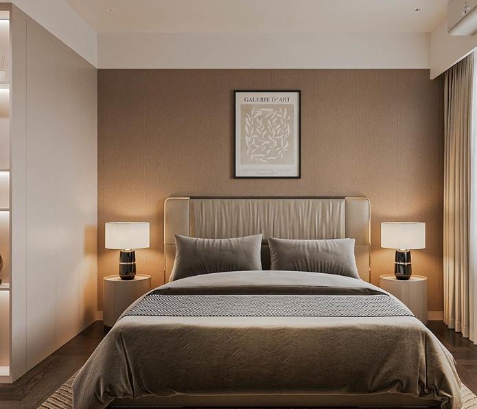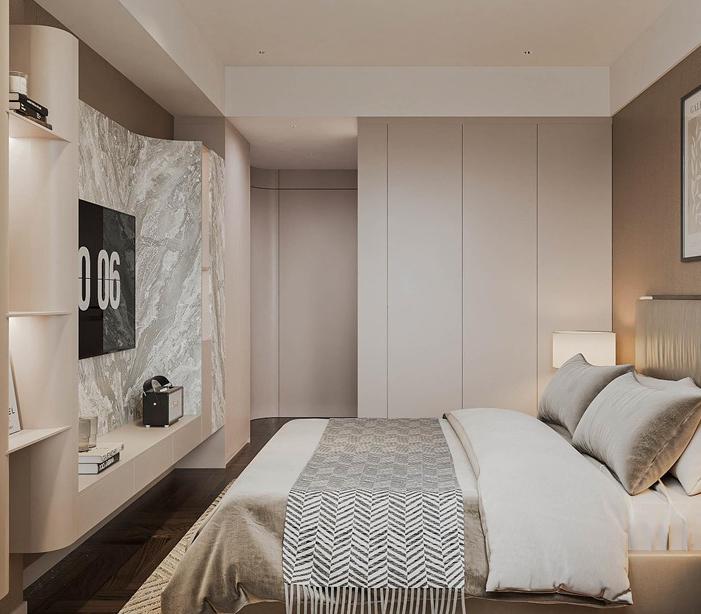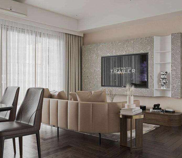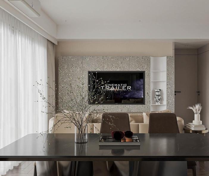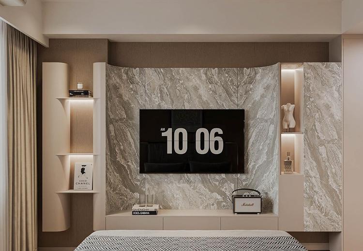 Căn hộ Masteri Thảo Điền, diện tích 92m2, được thiết kế theo phong cách hiện đại, tối ưu hóa không gian với việc sử dụng nội thất thông minh để gia tăng sự tiện nghi. Sự kết hợp giữa gam màu trung tính, những đường nét sắc sảo, và vật liệu công nghiệp bền bỉ như gỗ, đá, kim loại đã tạo nên một không gian sống đầy cá tính và lịch lãm, phản ánh gu thẩm mỹ tinh tế của gia chủ. Điểm nhấn đặc biệt là khu vực treo tivi ốp đá tinh tế, cùng hệ thống đèn chiếu sáng bao gồm đèn trần và đèn LED, không chỉ làm nổi bật vẻ đẹp của nội thất mà còn mang lại ánh sáng hoàn hảo, tăng thêm nét lung linh, hiện đại cho không gian.