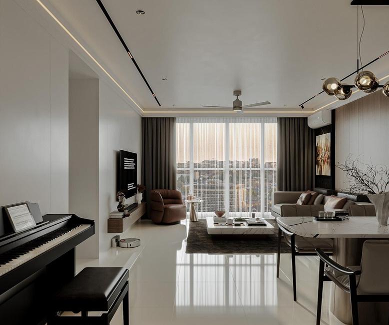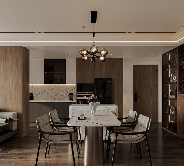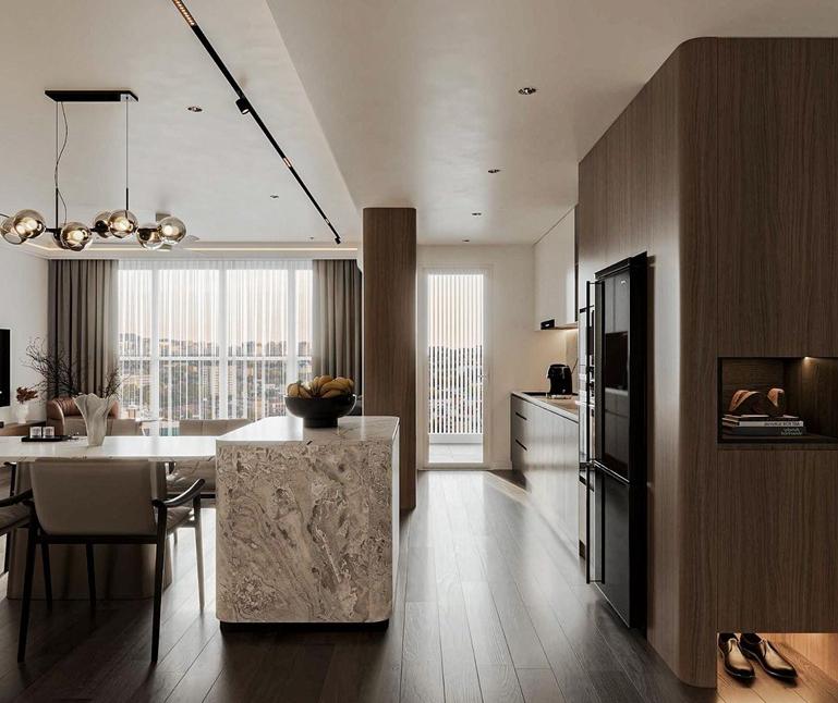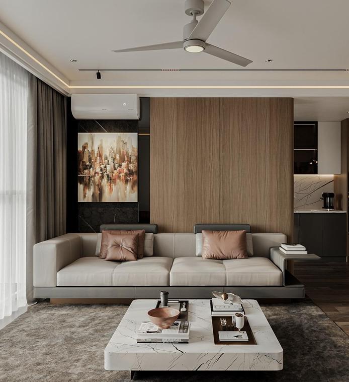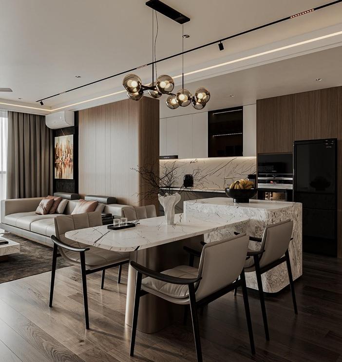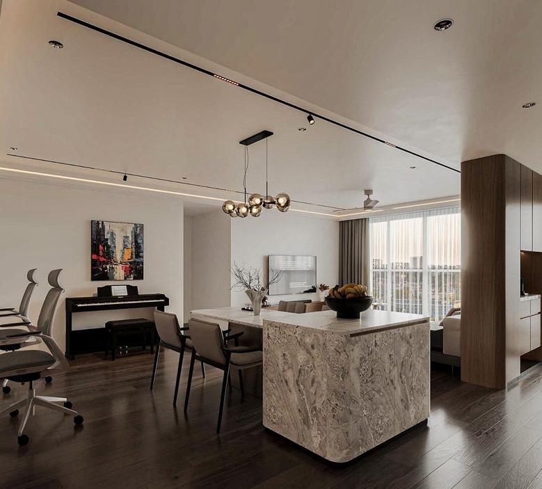 Phong cách hiện đại nhấn mạnh sự sang trọng và tinh tế thông qua việc sử dụng các vật liệu cao cấp và tông màu trung tính. Phòng khách được bố trí gọn gàng với bộ sofa màu kem, kết hợp hài hòa với bàn trà mặt đá và tường ốp gỗ, tạo nên không gian ấm cúng và sang trọng. Bàn ăn sử dụng mặt đá cẩm thạch trắng, kết hợp cùng đèn trần kiểu dáng độc đáo, tạo nên điểm nhấn hiện đại và đẳng cấp cho không gian. Phòng làm việc được bố trí bàn và tủ kệ, phù hợp cho không gian làm việc tại nhà nhưng vẫn giữ được vẻ đẹp thẩm mỹ. Mỗi chi tiết nội thất trong căn hộ đều được chăm chút tỉ mỉ, từ hệ thống ánh sáng, vật liệu cho đến bố trí không gian, mang lại sự hài hòa và thống nhất cho tổng thể căn hộ.