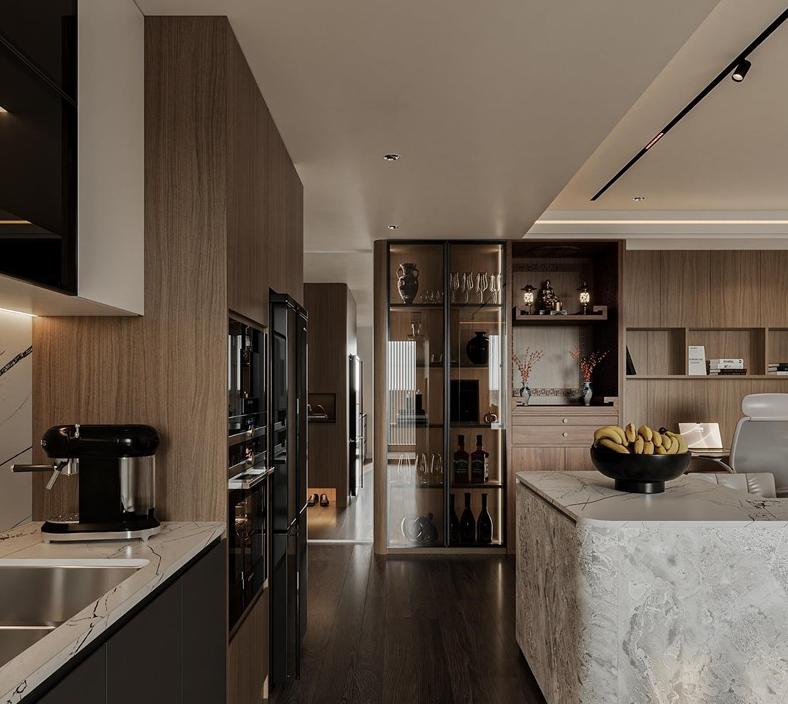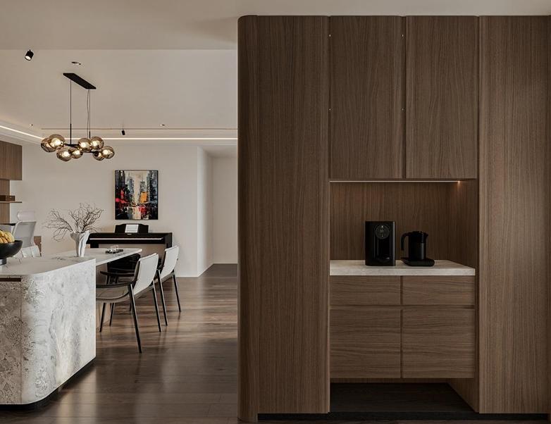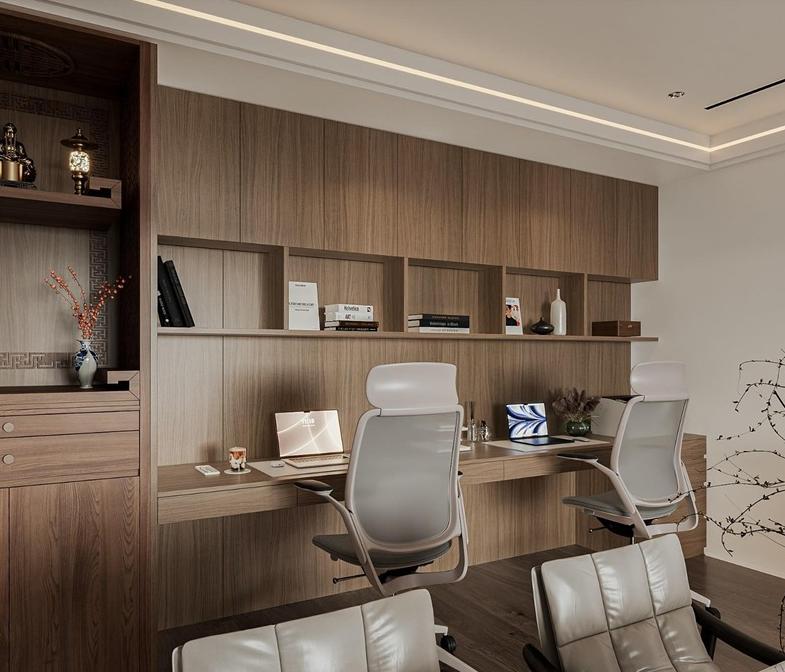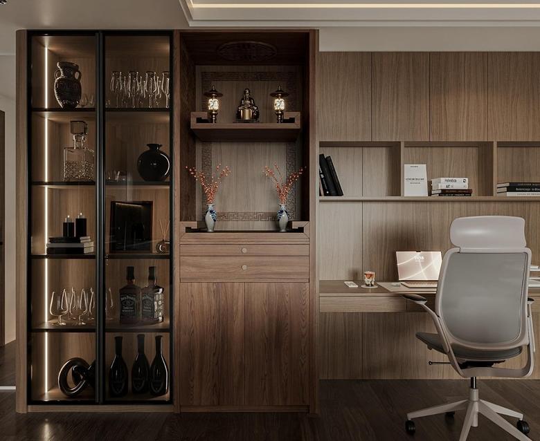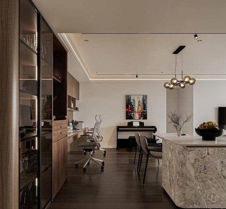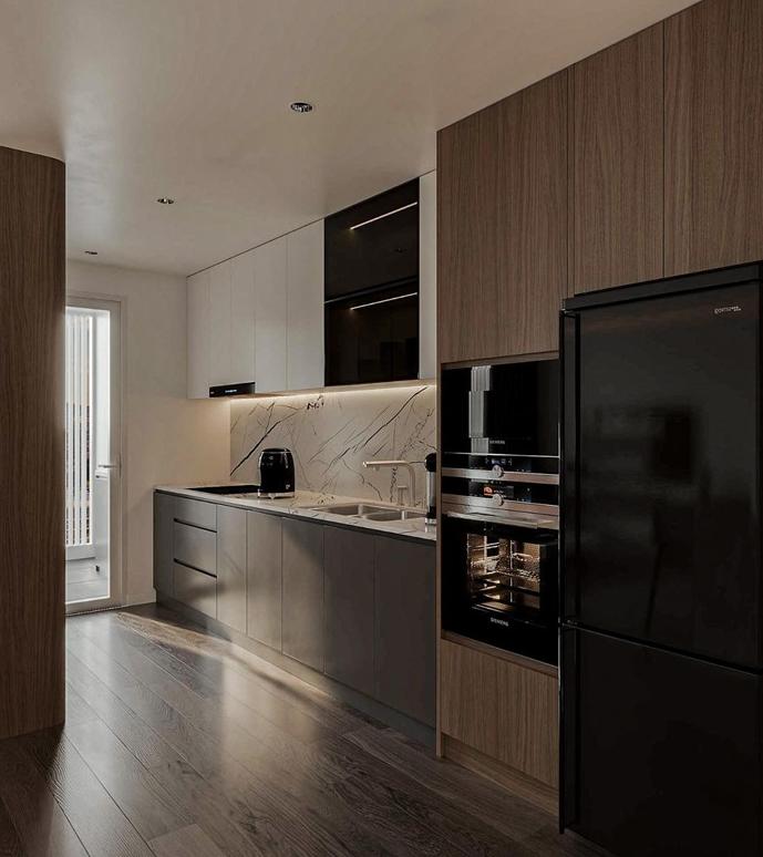 Phong cách hiện đại nhấn mạnh sự sang trọng và tinh tế thông qua việc sử dụng các vật liệu cao cấp và tông màu trung tính. Phòng khách được bố trí gọn gàng với bộ sofa màu kem, kết hợp hài hòa với bàn trà mặt đá và tường ốp gỗ, tạo nên không gian ấm cúng và sang trọng. Bàn ăn sử dụng mặt đá cẩm thạch trắng, kết hợp cùng đèn trần kiểu dáng độc đáo, tạo nên điểm nhấn hiện đại và đẳng cấp cho không gian. Phòng làm việc được bố trí bàn và tủ kệ, phù hợp cho không gian làm việc tại nhà nhưng vẫn giữ được vẻ đẹp thẩm mỹ. Mỗi chi tiết nội thất trong căn hộ đều được chăm chút tỉ mỉ, từ hệ thống ánh sáng, vật liệu cho đến bố trí không gian, mang lại sự hài hòa và thống nhất cho tổng thể căn hộ.